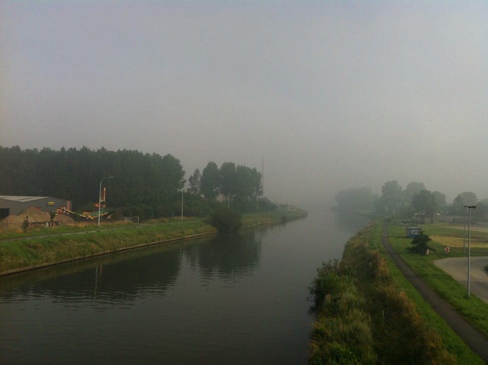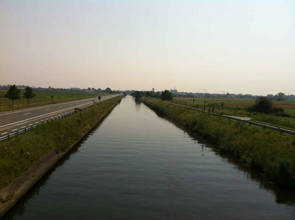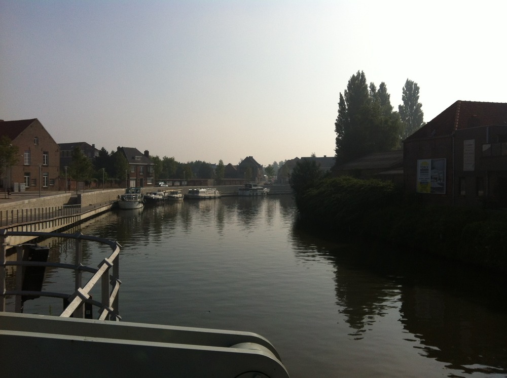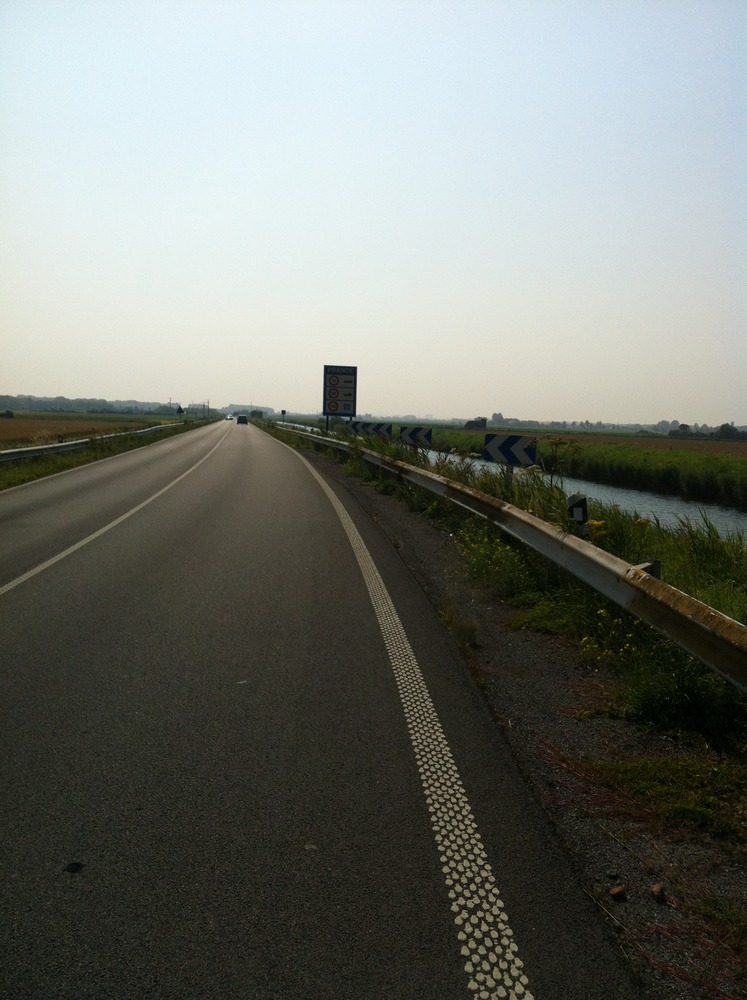 My steel horse champing at the cleat in crepuscular Brussels, I headed west and crossed the Brussels-Scheldt canal. At 20 miles, the River Dender at Ninove was draped in mist. Eleven miles of soggy low visibility later, and I arrived at the Grote Markt at Zottegem, empty but for the statue of the Count of Egmont. Flemings seldom venture out of their homes before 9am. Their well-breakfasted cats loiter in the driveways. Another eight miles through dew-drenched Payottenland: still no Flemings, but the occasional donkey. The Scheldt at Gavere is the ancient boundary between the Western and Eastern Franks; nowadays apparently they speak Flemish, though I can’t attest to this as there still weren’t any human beings in evidence. 152 miles to Hackney. Next I crossed the Lys at Deinze, and stopped off for koffie en croissantje.