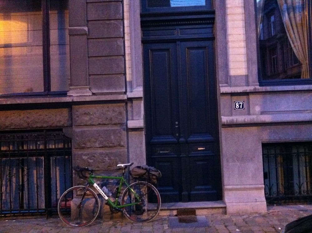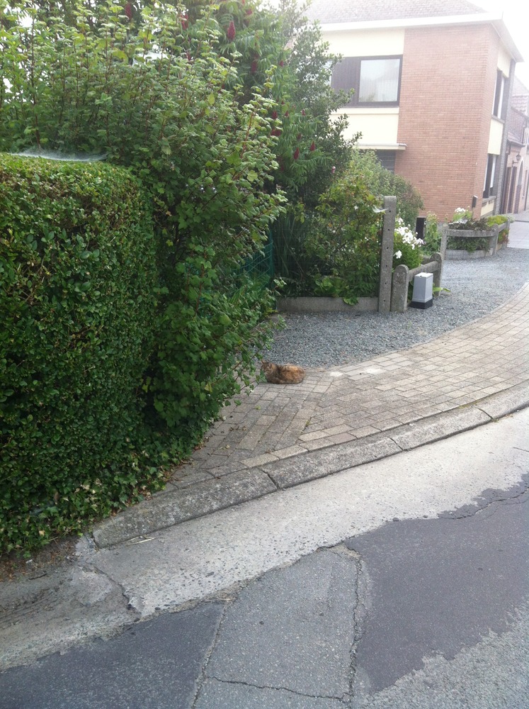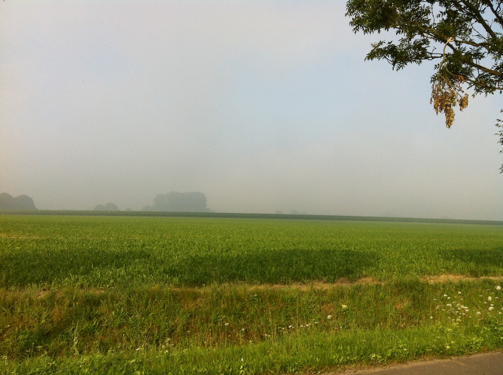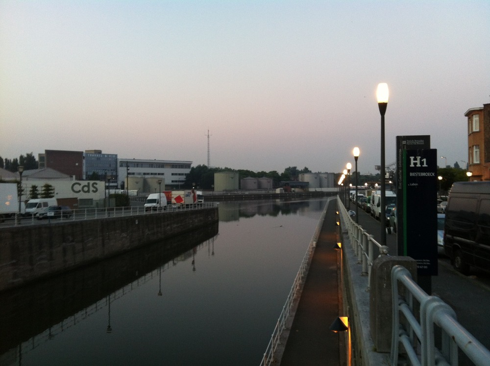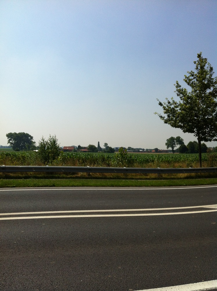 My steel horse champing at the cleat in crepuscular Brussels, I headed west and crossed the Brussels-Scheldt canal. At 20 miles, the River Dender at Ninove was draped in mist. Eleven miles of soggy low visibility later, and I arrived at the Grote Markt at Zottegem, empty but for the statue of the Count of Egmont. Flemings seldom venture out of their homes before 9am. Their well-breakfasted cats loiter in the driveways. Another eight miles through dew-drenched Payottenland: still no Flemings, but the occasional donkey. The Scheldt at Gavere is the ancient boundary between the Western and Eastern Franks; nowadays apparently they speak Flemish, though I can’t attest to this as there still weren’t any human beings in evidence. 152 miles to Hackney. Next I crossed the Lys at Deinze, and stopped off for koffie en croissantje.