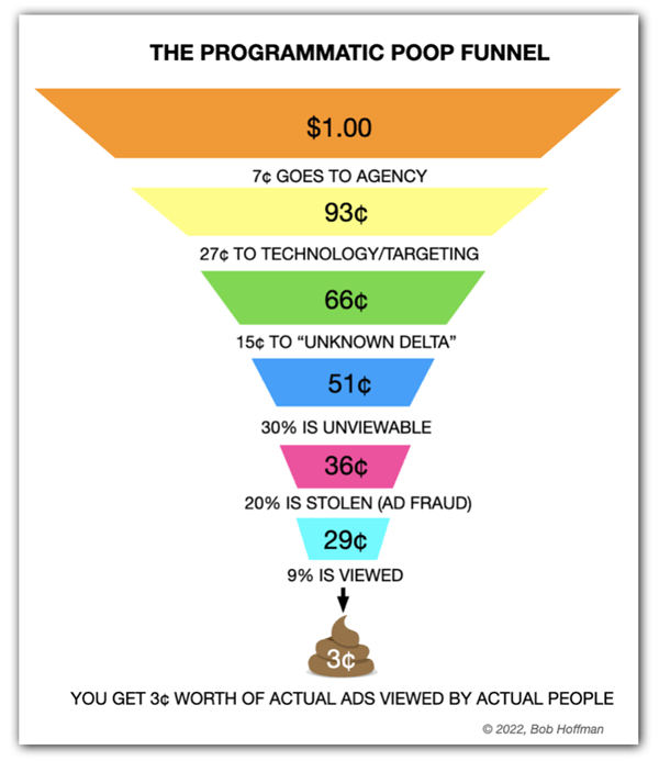 Does the adtech ecosystem have to be like this? Is the surveillance that fires a $64.8 billion industry really worth the cost to the privacy of billions of individuals, even assuming that it’s legal? Who are the real winners and losers from Hoffman’s Programmatic Poop Funnel? How sustainable can it be for 23% of the 160 million tonnes CO2e emitted by online advertising is ‘invalid traffic’