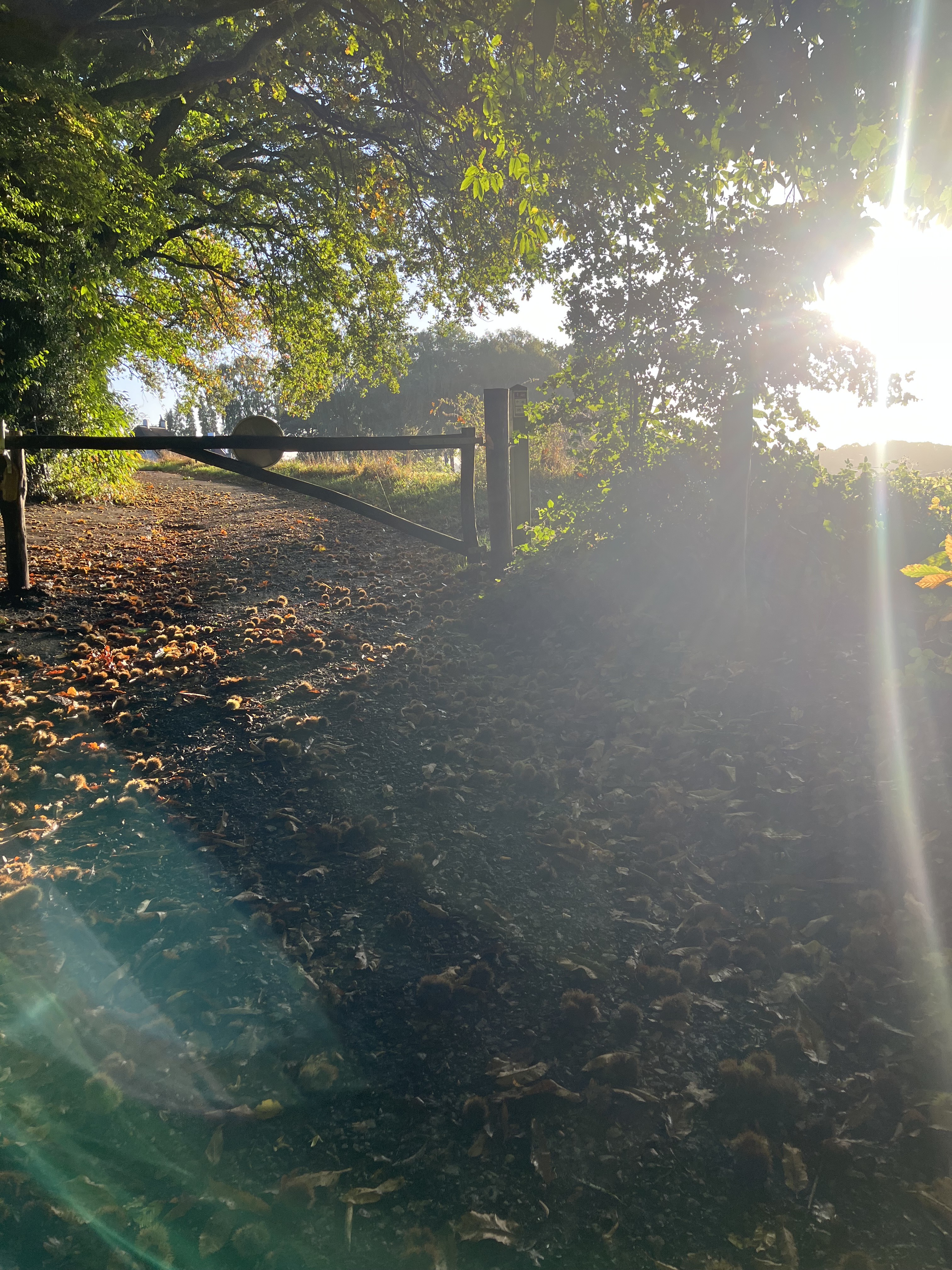 Amidst this nosegay of noticings, chestnuts in their spiky husks, everywhere now, she stamps and gathers up the shiny harvests. She knows that they are edible because they have a little tassel. The beech husks, too, prickly on the outside, she knows they are soft and pillowy on the inside. Still closed, I stashed one of those in my pocket and left it on my desk, and by the end of an anxious workday it had opened up to reveal its downy interior, wide enough for your little finger.